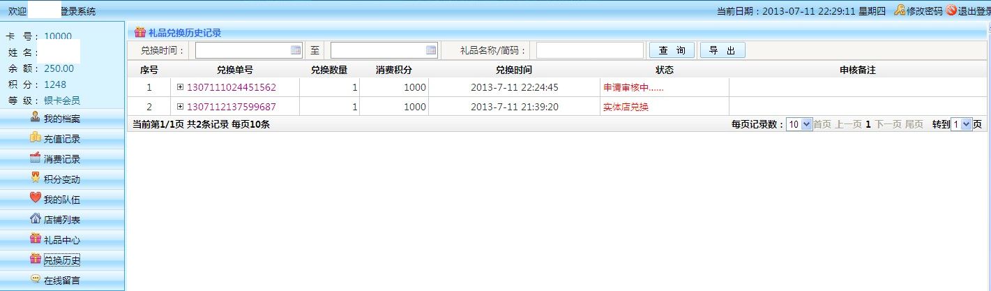 消費(fèi)記錄: 1.查詢:可以根據(jù)兌換單號 時間段 等條件查詢 2.導(dǎo)出:可以將按條件查詢出來的數(shù)據(jù),以Excel表格形式導(dǎo)出 3.列表:雙擊兌換單號,可以查看消費(fèi)詳情 (見下圖)