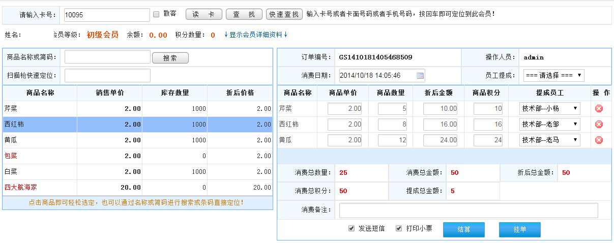 先會(huì)員刷卡,然后輸入商品的名稱或簡(jiǎn)碼或者掃描槍快速定位查找商品;或者直接點(diǎn)擊商品選擇;選擇商品后點(diǎn)擊結(jié)算此訂單如圖顯示: