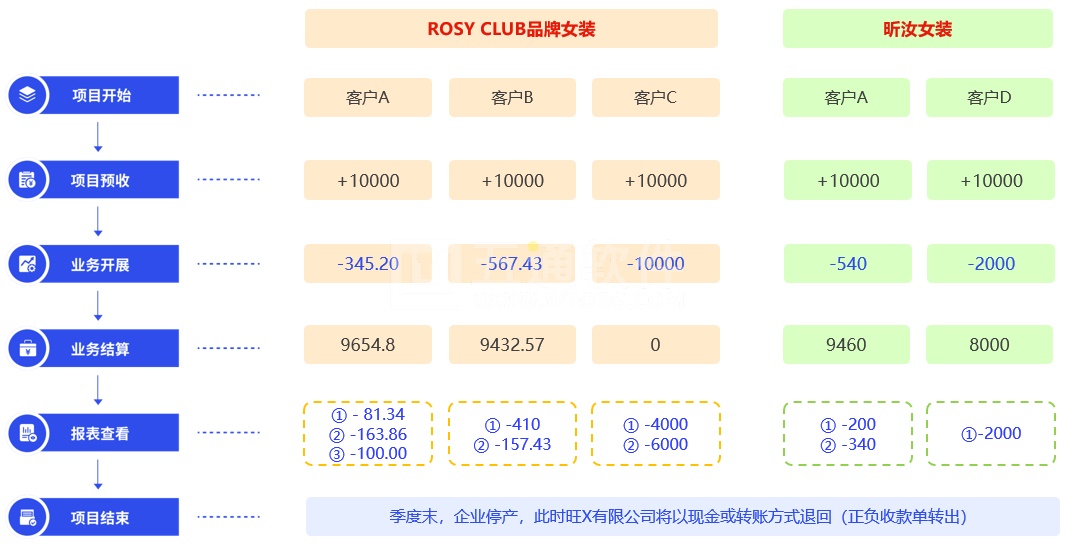 湖南旺X有限公司為貼牌生產(chǎn)(兩種不同品牌長裙):要求下游經(jīng)銷商均要在季度末預(yù)交1w元,用于下季度拿貨;下季度末停產(chǎn)時,未用完的金額將退還